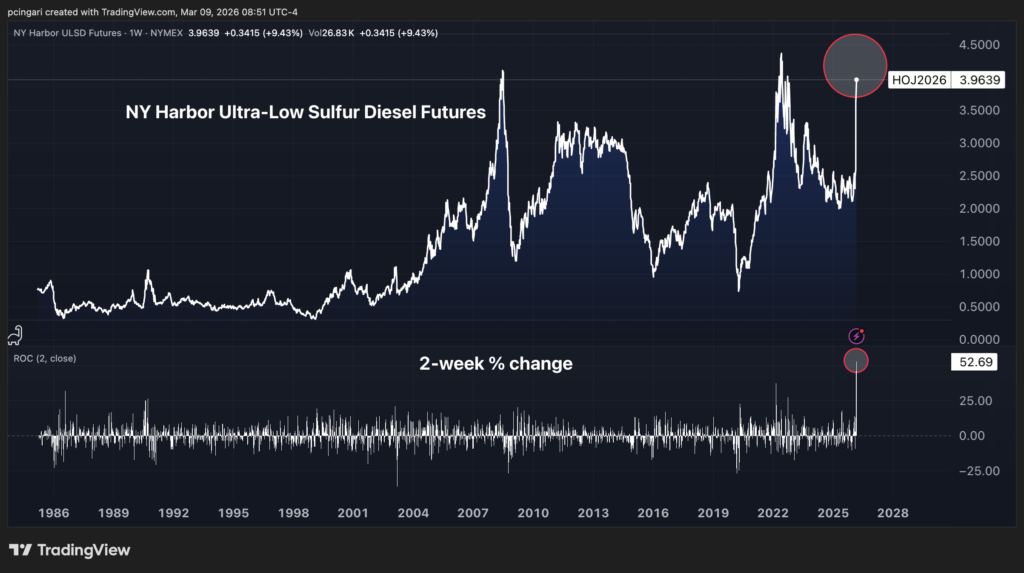 Wholesale diesel prices have surged about 53% in just seven days since the start of the war in Iran, marking the largest 2-week increase on record for the commodity.